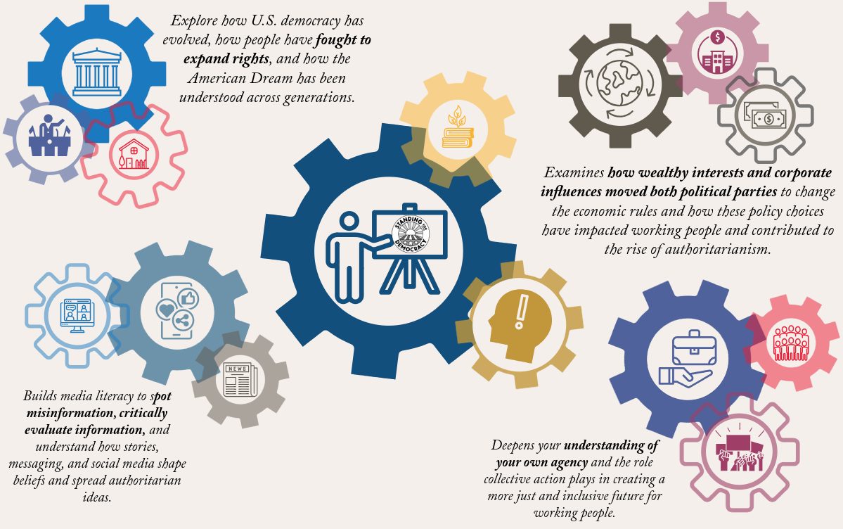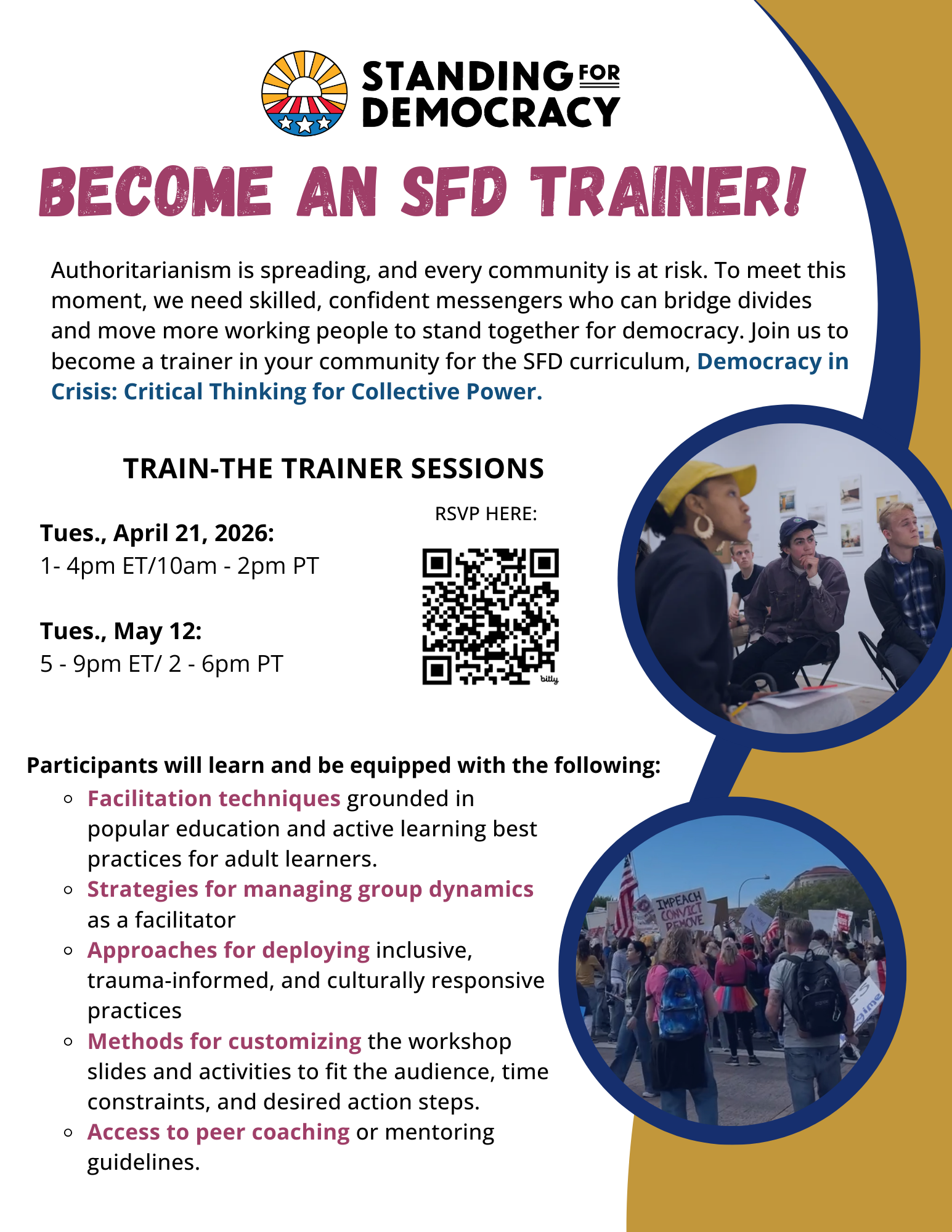 SFD has designed a unique way to give ordinary working people a tool to talk to their neighbors, coworkers, and friends. We developed a popular education curriculum, Democracy in Crisis: Critical Thinking for Collective Power, to help working people better understand the rise of the authoritarian right and its effects on their lives. The curriculum explores why these dynamics are often obscured, builds awareness of our collective power to defend democracy, and strengthens media literacy skills to identify misinformation and question dominant narratives.
